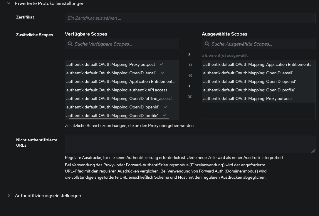 Die Felder /User-id und Scopes – also die User-id mit der ein leerer User angelegt wird, wenn es keinen gibt und die Felder, bei denen Authentik und Anwendung abgeglichen werden – Da ist jede Anwendung anders und das muss genau passen.)