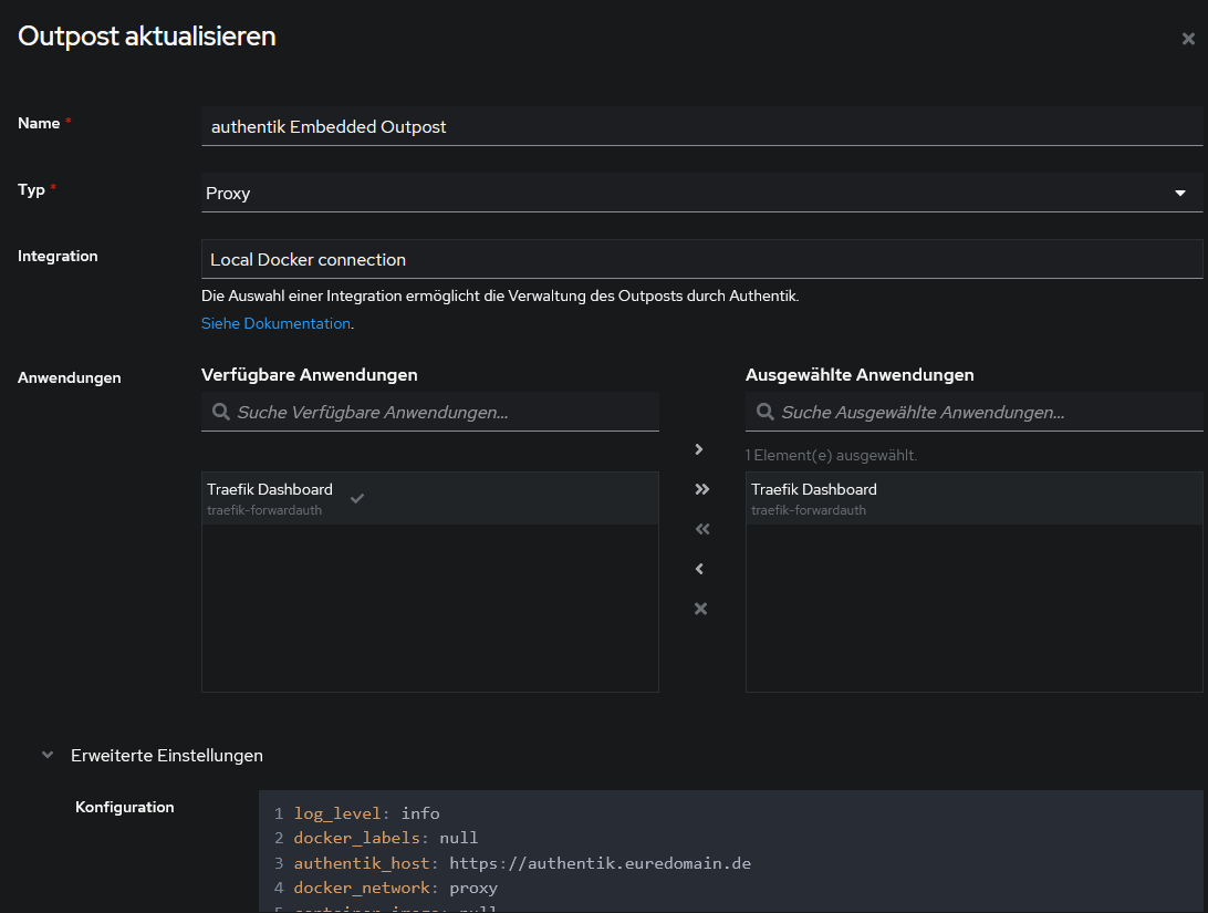{ "Message": "no app for hostname", "Host": "traefik.meinedomain.de", "Detail": "Check the outpost settings and make sure 'traefik.meinedomain.de' is included." }Im Outposts wir der Eintrag zu Traefik mit einen grünen Haken angezeigt, dass die Anmeldung über https://auth.meinedomain.de erfolgen kann.